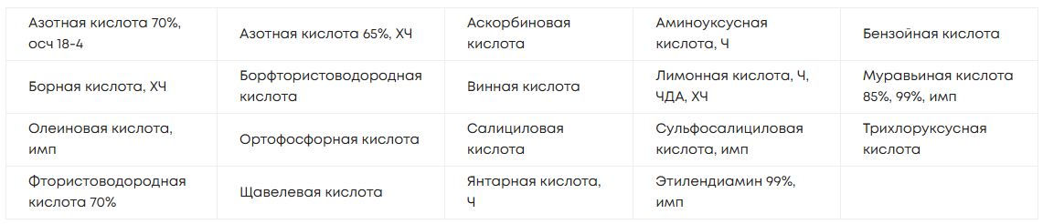 | Борная кислота, ХЧ | Борфтористоводородная кислота | Винная кислота | Лимонная кислота, Ч, ЧДА, ХЧ | Муравьиная кислота 85%, 99%, имп |