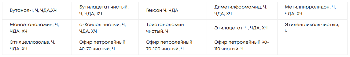 | Бутанол-1, Ч, ЧДА,ХЧ | Бутилацетат чистый, Ч, ЧДА, ХЧ | Гексан Ч, ЧДА | Диметилформамид, Ч, ЧДА, ХЧ | Метилпирролидон, Ч, ЧДА, ХЧ |
