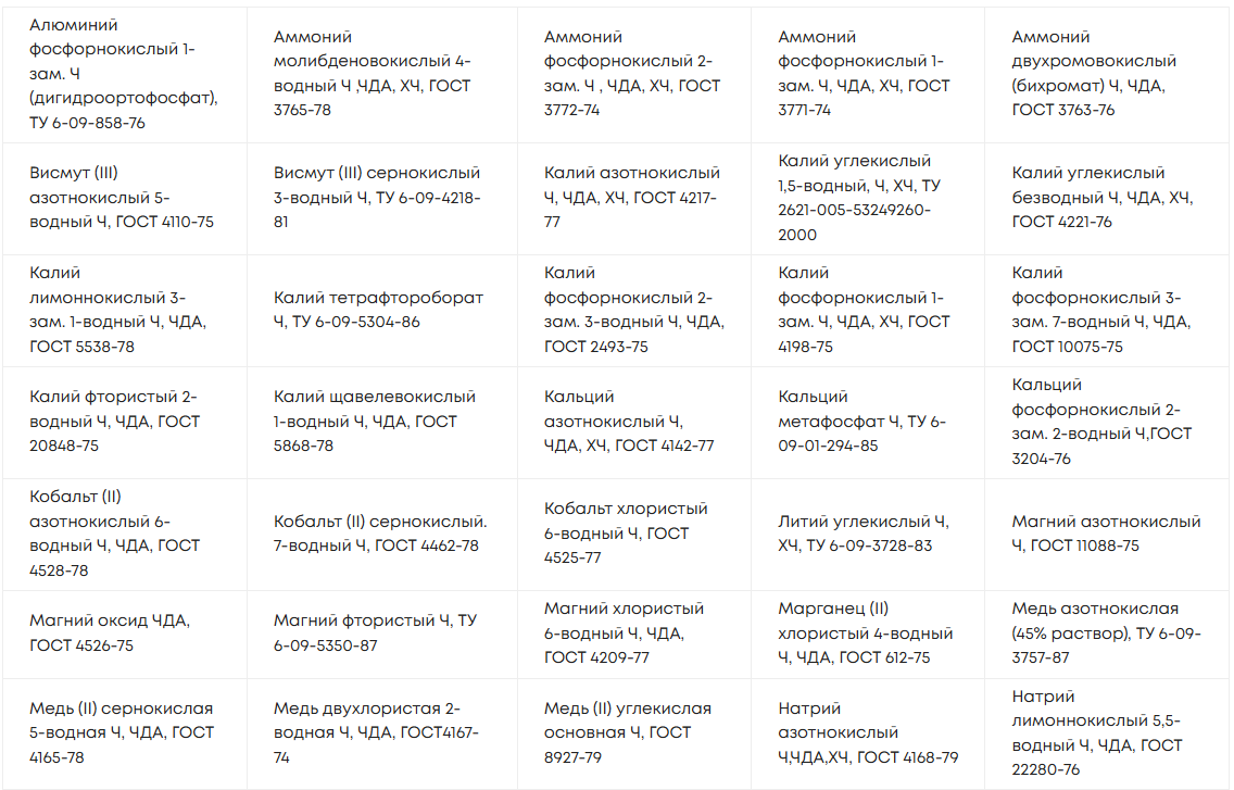 | Медь (II) сернокислая 5-водная Ч, ЧДА, ГОСТ 4165-78 | Медь двухлористая 2-водная Ч, ЧДА, ГОСТ4167-74 | Медь (II) углекислая основная Ч, ГОСТ 8927-79 | Натрий азотнокислый Ч,ЧДА,ХЧ, ГОСТ 4168-79 | Натрий лимоннокислый 5,5-водный Ч, ЧДА, ГОСТ 22280-76 |