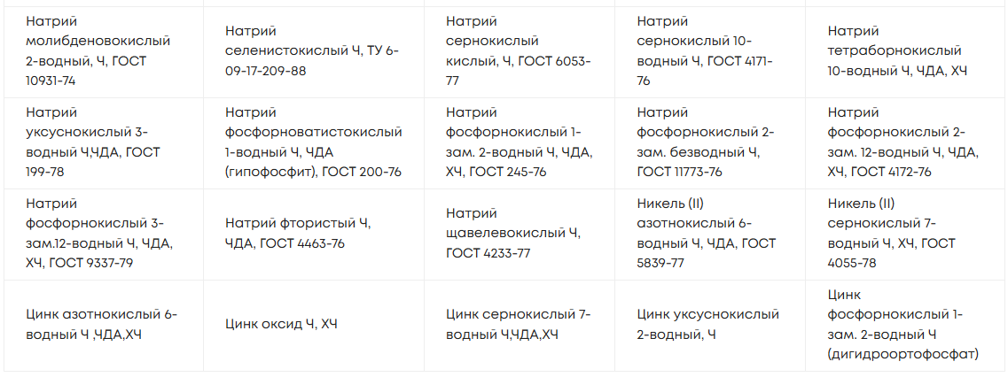 | Натрий уксуснокислый 3-водный Ч,ЧДА, ГОСТ 199-78 | Натрий фосфорноватистокислый 1-водный Ч, ЧДА (гипофосфит), ГОСТ 200-76 | Натрий фосфорнокислый 1-зам. 2-водный Ч, ЧДА, ХЧ, ГОСТ 245-76 | Натрий фосфорнокислый 2-зам. безводный Ч, ГОСТ 11773-76 | Натрий фосфорнокислый 2-зам. 12-водный Ч, ЧДА, ХЧ, ГОСТ 4172-76 |