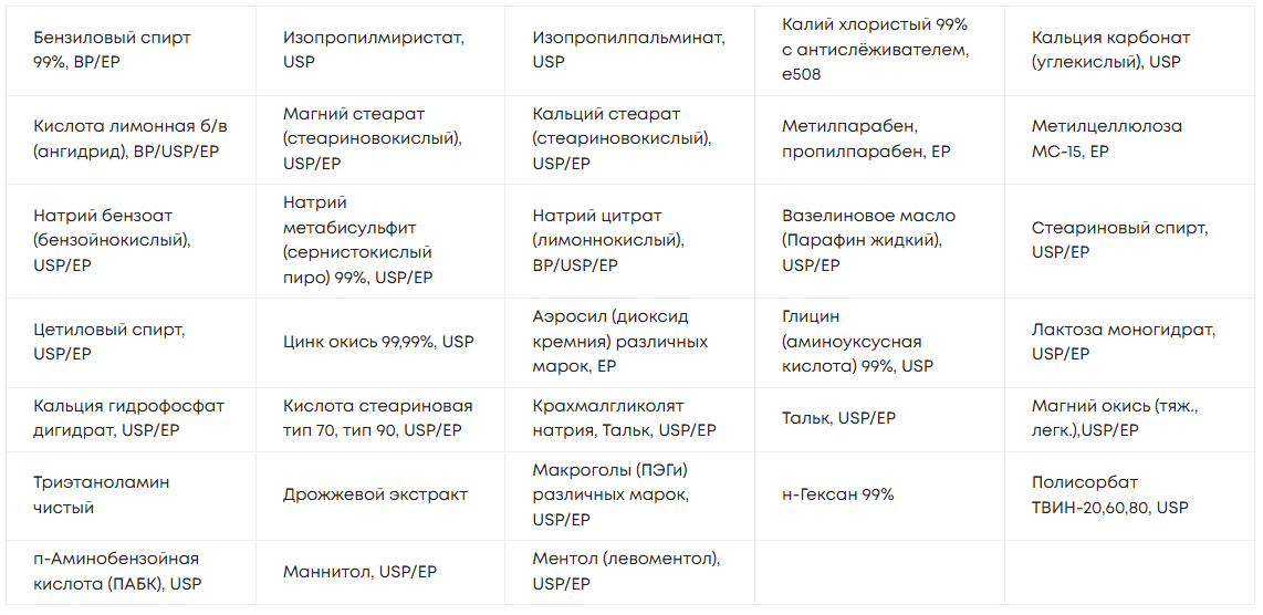 | Натрий бензоат (бензойнокислый), USP/EP | Натрий метабисульфит (сернистокислый пиро) 99%, USP/EP | Натрий цитрат (лимоннокислый), BP/USP/EP | Вазелиновое масло (Парафин жидкий), USP/EP | Стеариновый спирт, USP/EP |